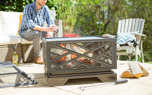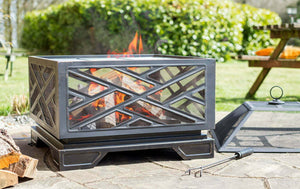 The Brooklyn Fire Pit has a remarkably striking appearance, a cube of metal, its sides decorated by diagonal strips in-filled by wire mesh. Inside, the conflagration will generate a warming amount of heat from either timber logs or charcoal – whatever is your preference.